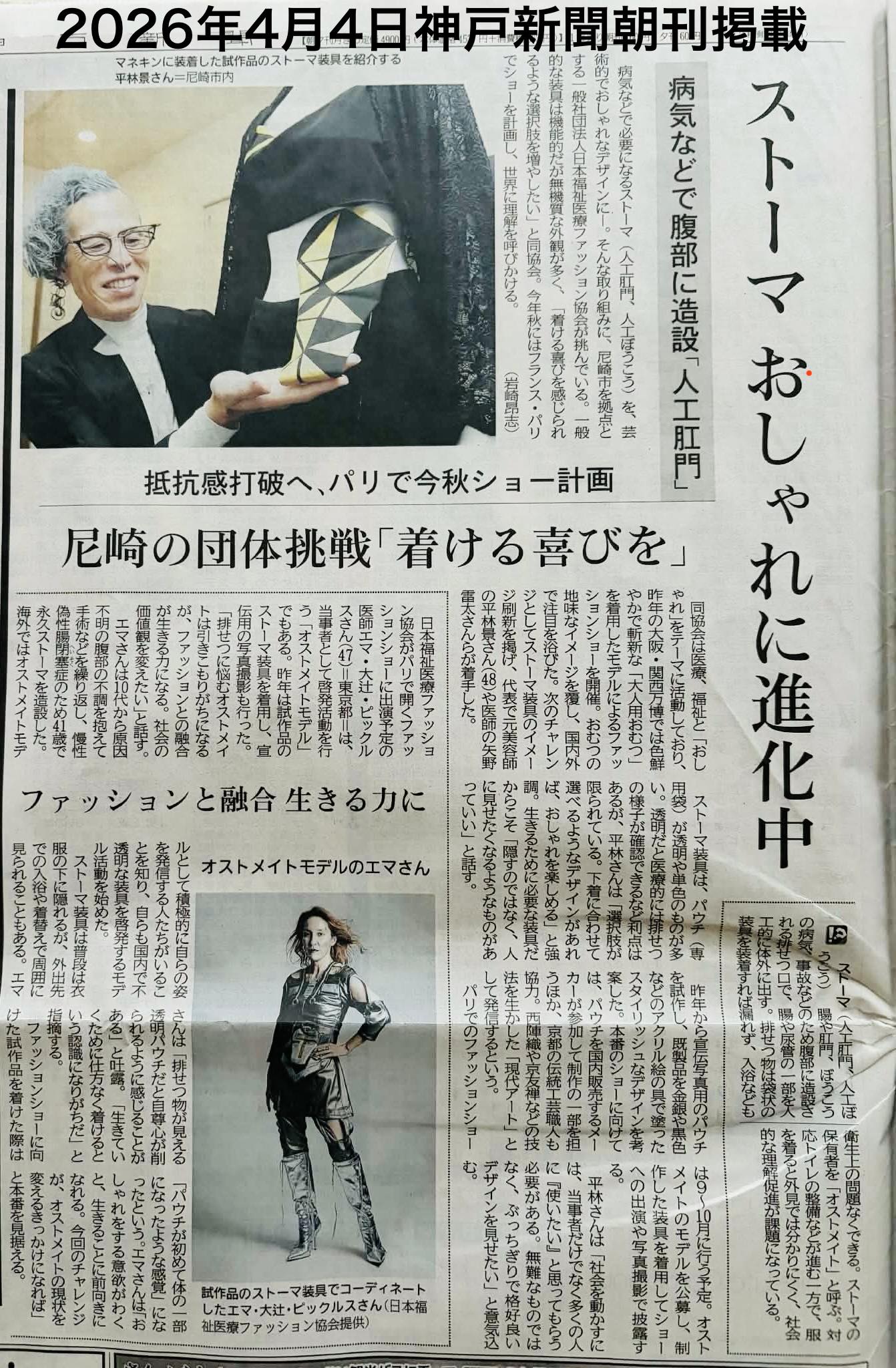 2026年4月4日の神戸新聞に掲載 2026 4/07 2026年4月5日 STOMA Néo-ART Project について、神戸新聞にて大きく取り上げていただきました! メディア Storma Néo-ART オストメイトモデル募集開始! 関連記事関連する記事はまだ見つかりませんでした。